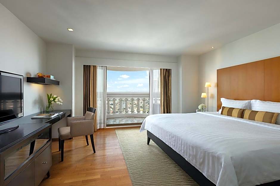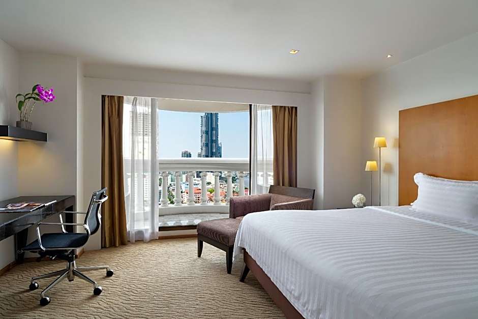 This spacious suite has beautiful views of Bangkok City from its private balcony. It includes a separate living area . Its private bathroom has a separate a bathtub and a shower cubicle.