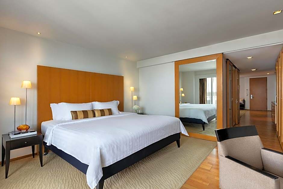 This spacious suite has beautiful views of Bangkok City from its private balcony. It includes a separate living area . Its private bathroom has a separate a bathtub and a shower cubicle.